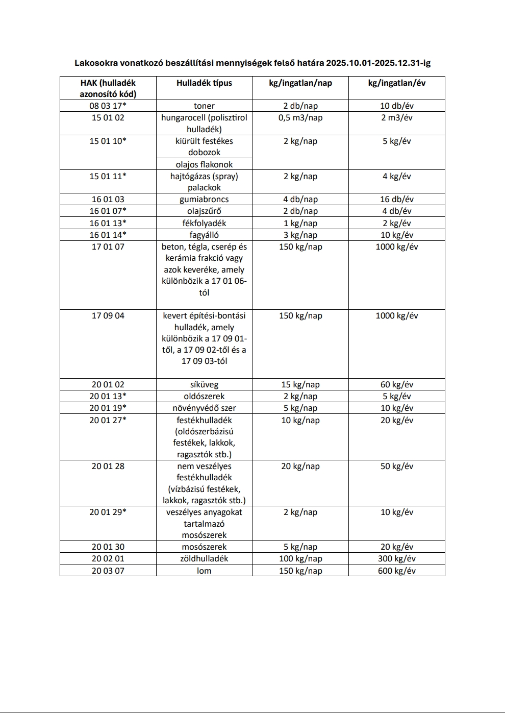 2025. október 1-jétől módosulnak a lakosság által beszállítható egyes hulladéktípusokra vonatkozó napi mennyiségi korlátozások. A pontos, típusonkénti új határokat az alábbi táblázatban találják. Kérjük, hogy októbertől a beszállítások tervezésekor már ezek szerint járjanak el. Megértésüket köszönjük!